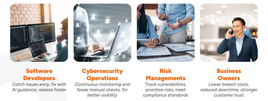 Dengan pemindaian real-time, manajemen tugas terintegrasi, dan remediasi berbasis AI, bantu tim Anda fokus pada pertumbuhan, bukan pemadaman kebakaran.
