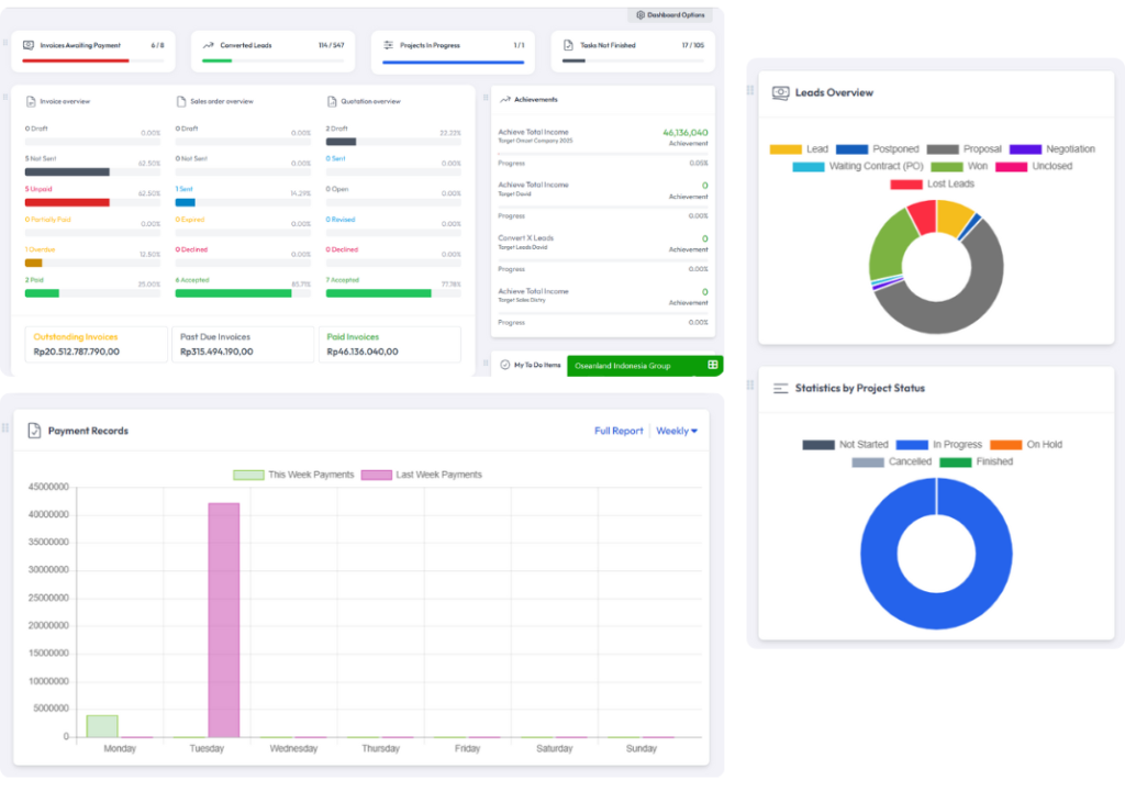 Anda bisa melihat penjualan, pembelian, tugas, hingga laporan keuangan secara real-time.