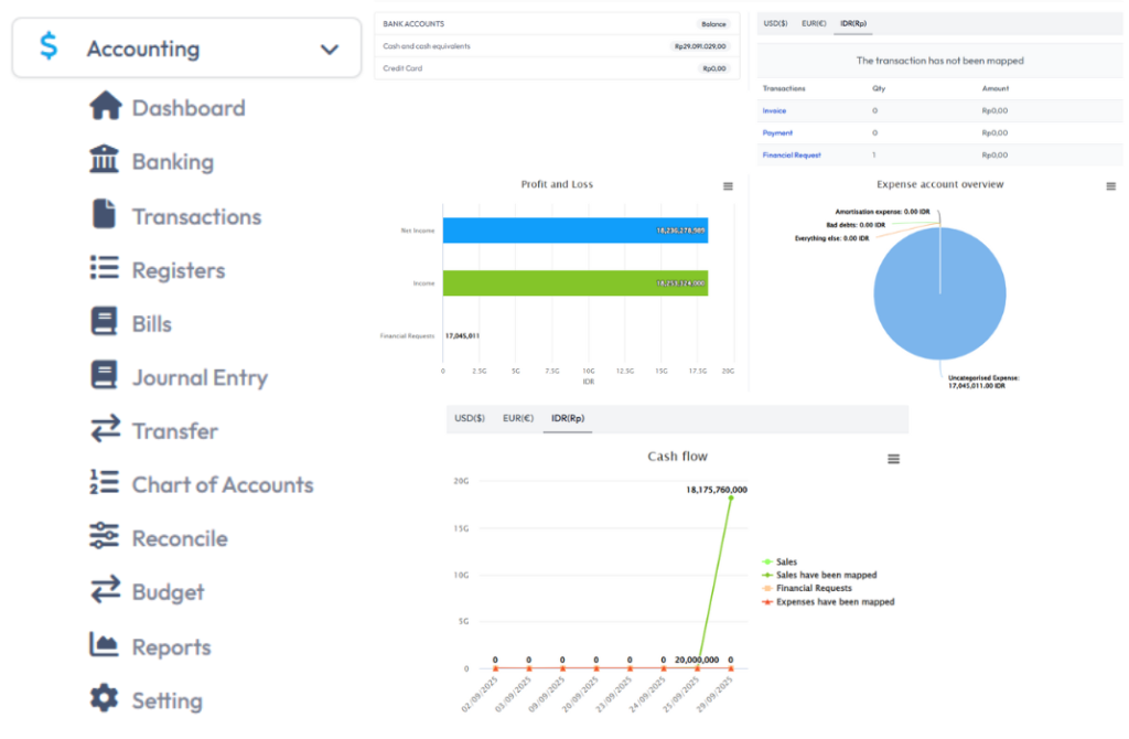 Pencatatan keuangan otomatis yang akurat dan sesuai standar akuntansi. Semua transaksi tercatat dengan rapi, mulai dari kas masuk/keluar, laporan laba rugi, hingga neraca keuangan.
