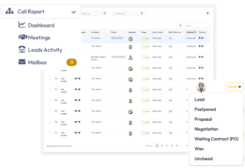 Semua interaksi dengan pelanggan dapat tercatat rapi melalui Call Report. Fitur ini membantu melacak panggilan masuk maupun keluar, catatan percakapan, serta tindak lanjut yang harus dilakukan.