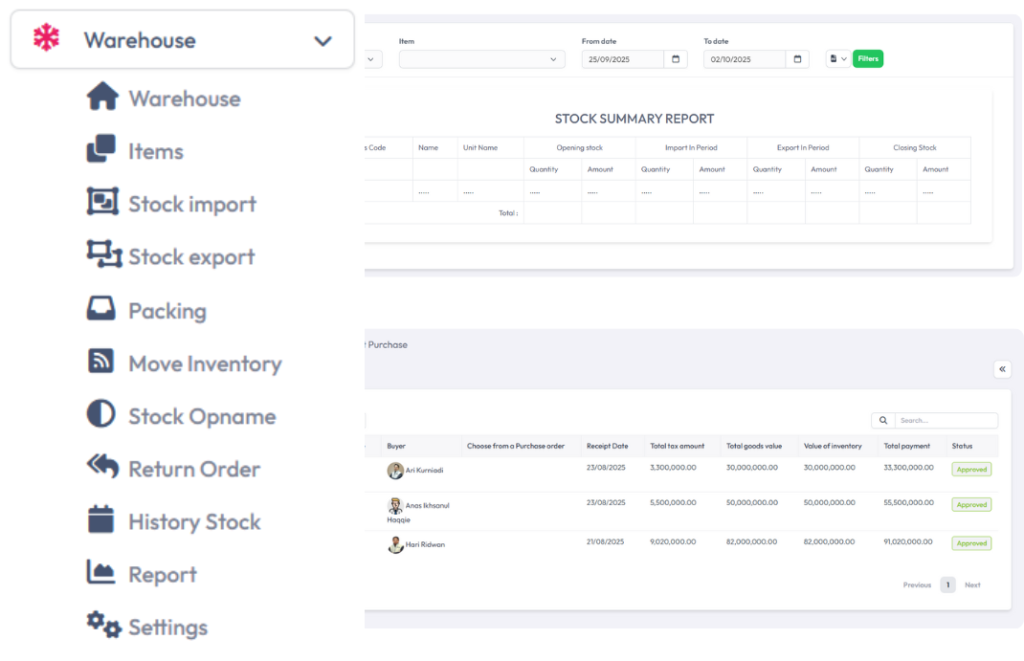 Kelola stok gudang secara efisien dengan sistem persediaan real-time. Anda bisa melihat jumlah barang yang tersedia, barang masuk/keluar, hingga laporan persediaan yang detail. Fitur ini membantu mencegah kekurangan atau kelebihan stok, serta mendukung distribusi lebih lancar.