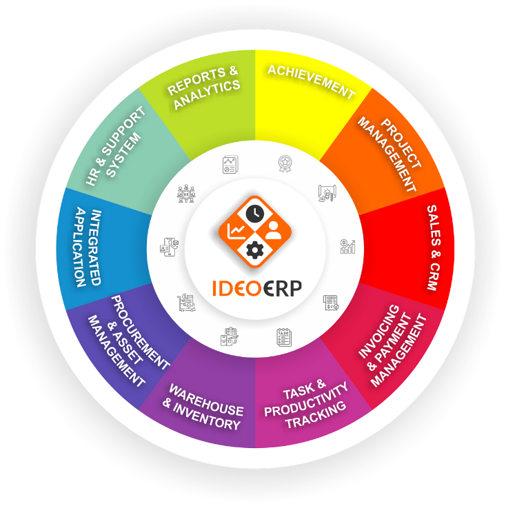 Selain itu, terdapat modul Task & Productivity Tracking, Warehouse & Inventory, Procurement & Asset Management, Integrated Application, dan HR & Support System yang saling terhubung, menjadikan IdeoERP solusi digital lengkap untuk efisiensi, kolaborasi, dan pertumbuhan bisnis.